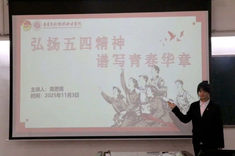 11月3日13:00点旅善楼104教室,团委秘书处组织部副部长周思雨以“弘扬五四精神,谱写青春华章”为主题开展第四讲。回顾了1919 年五四运动的壮阔历程,深刻阐述了“新民主主义革命开端”的伟大历史意义,挖掘“爱国、进步、民主、科学”的精神内核与时代价值,对团干部的职责与使命有了更深刻的理解。引导广大团干部进一步厚植爱国情怀、赓续红色血脉,以青年担当践行时代使命。