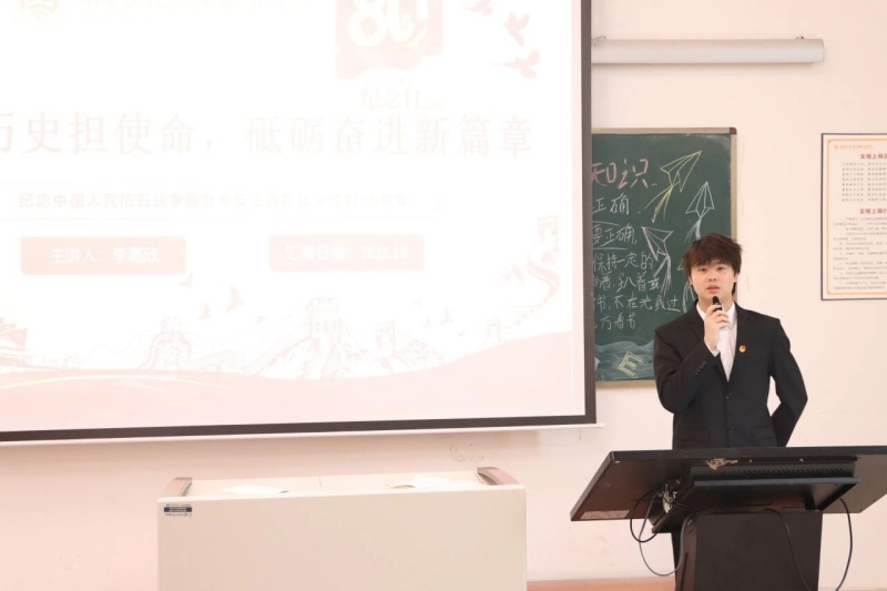 10月24日13:00在旅善楼104教室,团委秘书处学生副书记李嘉欣以“铭记历史担使命,砥砺奋进新篇章”为主题开展第二讲。以1931-1945年十四年抗战时间线为轴,串联九一八事变、英雄事迹、关键战役、全民觉醒等节点,回顾了十四年中国人民抗日战争和抗战历程的壮阔历史,深刻阐述了伟大而深远的历史意义,挖掘蕴含的精神财富和时代价值,引导广大团干部进一步坚定理想信念、勇担时代使命、继承和弘扬伟大抗战精神。