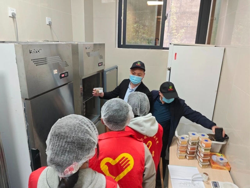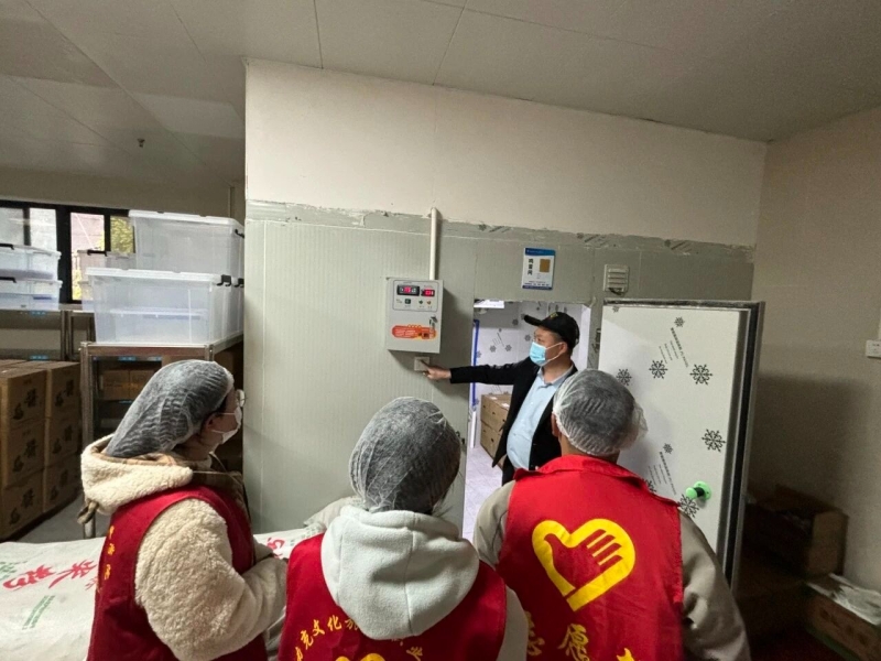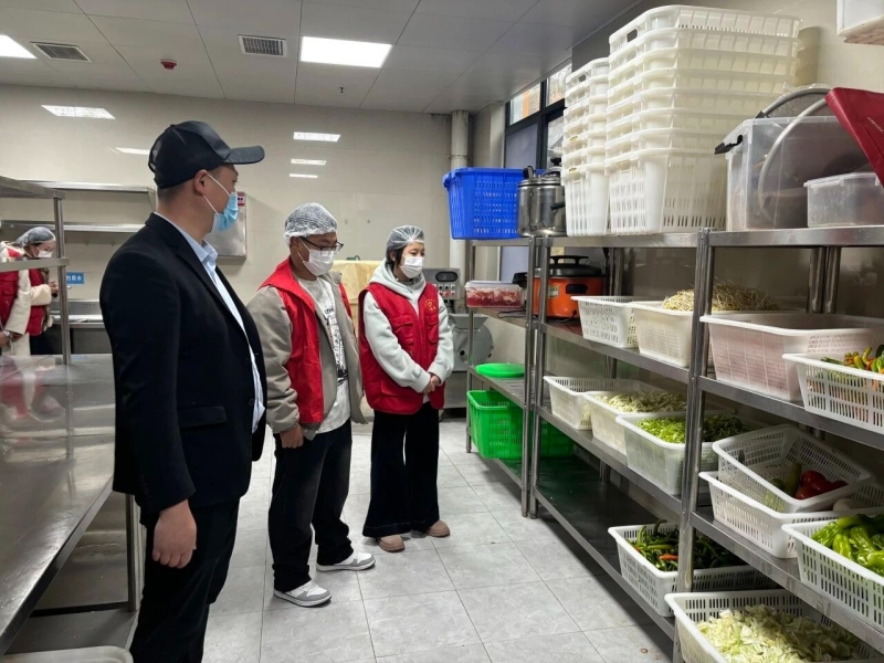 活动中,志愿者们在食堂工作人员的带领下,依次参观了食材储存区、清洗加工区、烹饪操作区、餐具消毒区等重点区域。大家认真查看后厨环境卫生、设备清洁维护、食材分类存放、食品留样记录等情况,详细了解食材采购、储存、加工、烹饪等全流程管理规范.